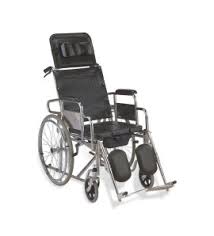 Fauteuil roulant avec assise, repose pied et accoudoirs rembourrés, dossier et repose pieds inclinables à l’aide d’un levier manuel et appui-tête amovible pour le confort du patient. Structure en acier chromé.
