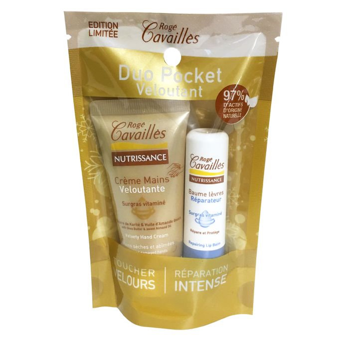 Rogé Cavaillès Duo Pocket Veloutant Crème Mains Veloutante 30 ml + Baume Lèvres 5,5 ml est composé de deux soins réparateurs, pour retrouver le plaisir d’une peau douce.